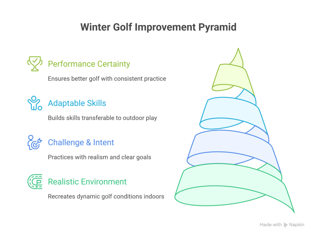 - Performance Phase (Weeks 5–6): Restore realism. Randomized slopes, Trackman Combines, and pressure ladders test whether skills hold under true constraints.